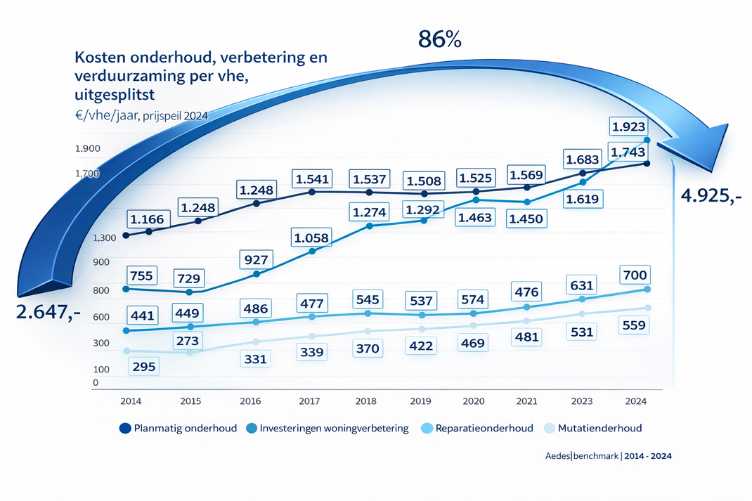 De instandhoudingskosten stijgen fors: volgens de Aedes-benchmark 2025 zijn de uitgaven aan onderhoud, verbetering en verduurzaming in tien jaar met 86% gestegen naar maar liefst € 4925,- per woning per jaar, de woningcorporaties komen gemiddeld € 45,- per woning te kort in het huishoudboekje.