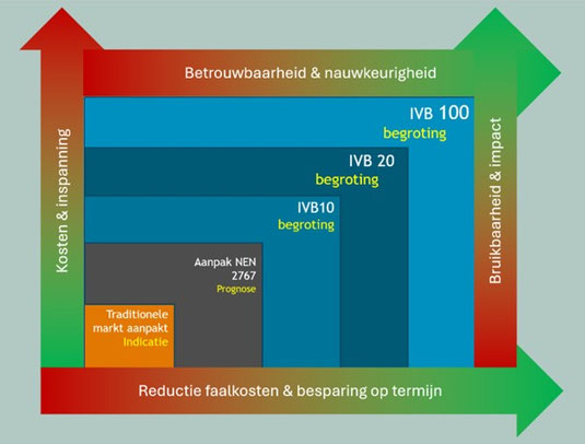 Definitie van de methodologie IVB; De methode IVB is een integrale aanpak voor het opstellen van vastgoedbegrotingen voor woningcorporaties. Deze methode omvat het ontwikkelen van MJOIB die gebaseerd zijn op gekwalificeerde en gedetailleerde kwaliteitsmetingen, waaronder inventarisaties en inspecties, uitgevoerd volgens bepaalde standaarden en protocollen. Een uniek aspect van de methode is de integrale benadering, die zich richt op twee assen: op alle ingrijpmomenten en op alle elementen op gebouwniveau. Hierdoor wordt aantoonbaar een betrouwbaar, volledig en nauwkeurig product geleverd.